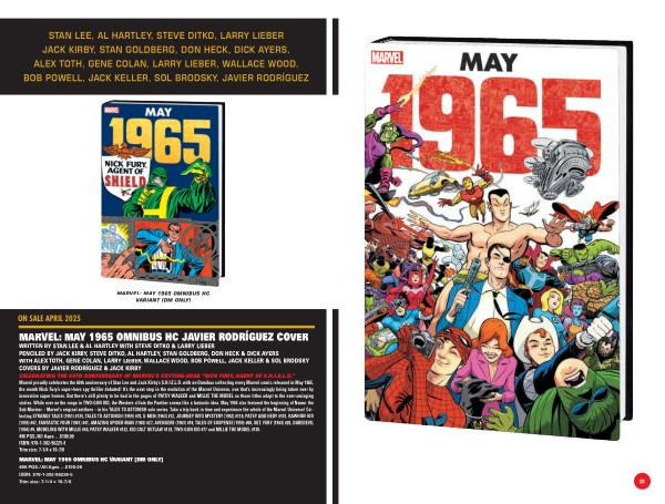 WRITTEN BY STAN LEE & AL HARTLEY WITH STEVE DITKO & LARRY LIEBER PENCILED BY JACK KIRBY , STEVE DITKO , AL HARTLEY , STAN GOLDBERG , DON HECK & DICK AYERS WITH ALEX TOTH , GENE COLAN , LARRY LIEBER , WALLACE WOOD , BOB POWELL , JACK KELLER & SOL BRODSKY COVERS BY JAVIER RODRÍGUEZ & JACK KIRBY CELEBRATING THE 60TH ANNIVERSARY OF MARVEL ’ S CUTTING-EDGE “ NICK FURY , AGENT OF S . H . I . E . L . D .” Marvel proudly celebrates the 60th anniversary of Stan Lee and Jack Kirby ’ s S . H . I . E . L . D . with an Omnibus collecting every Marvel comic released in May 1965 , the month Nick Fury ’ s super-hero spy thriller debuted ! It ’ s the next step in the evolution of the Marvel Universe , one that ’ s increasingly being taken over by innovative super heroes . But there ’ s still plenty to be had in the pages of PATSY WALKER and MILLIE THE MODEL as those titles adapt to the ever-swinging sixties . While over on the range in TWO-GUN KID , the Western villain the Panther seems like a fantastic idea . May 1965 also featured the beginning of Namor the Sub-Mariner – Marvel ’ s original antihero – in his TALES TO ASTONISH solo series . Take a trip back in time and experience the whole of the Marvel Universe ! Collecting STRANGE TALES ( 1951 ) # 135 , TALES TO ASTONISH ( 1959 ) # 70 , X-MEN ( 1963 ) # 12 , JOURNEY INTO MYSTERY ( 1952 ) # 118 , PATSY AND HEDY # 101 , RAWHIDE KID ( 1955 ) # 47 , FANTASTIC FOUR ( 1961 ) # 41 , AMAZING SPIDER-MAN ( 1963 ) # 27 , AVENGERS ( 1963 ) # 18 , TALES OF SUSPENSE ( 1959 ) # 68 , SGT . FURY ( 1963 ) # 20 , DAREDEVIL ( 1964 ) # 9 , MODELING WITH MILLIE # 40 , PATSY WALKER # 122 , KID COLT OUTLAW # 124 , TWO-GUN KID # 77 and MILLIE THE MODEL # 130 . 496 PGS ./ All Ages …$ 100.00 ISBN : 978-1-302-96225-8 Trim size : 7-1 / 4 x 10-7 / 8