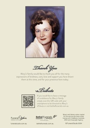 If you would like to leave a message of condolence for Mary ’ s family simply scan this QR code with your smartphone to be directed to Mary ’ s eTribute or visit bethelfunerals . com . au