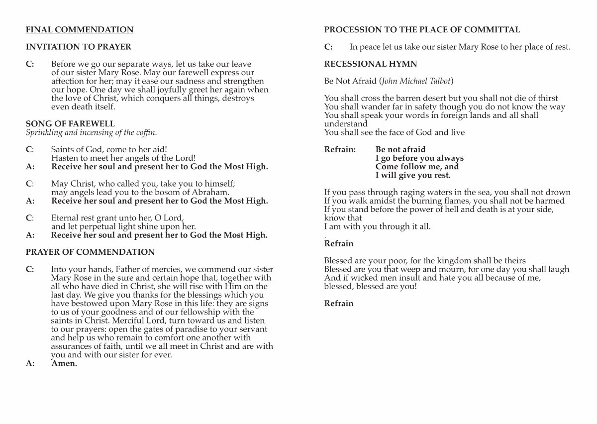 C: Into your hands, Father of mercies, we commend our sister Mary Rose in the sure and certain hope that, together with all who have died in Christ, she will rise with Him on the last day. We give you thanks for the blessings which you have bestowed upon Mary Rose in this life: they are signs to us of your goodness and of our fellowship with the saints in Christ. Merciful Lord, turn toward us and listen to our prayers: open the gates of paradise to your servant and help us who remain to comfort one another with assurances of faith, until we all meet in Christ and are with you and with our sister for ever.