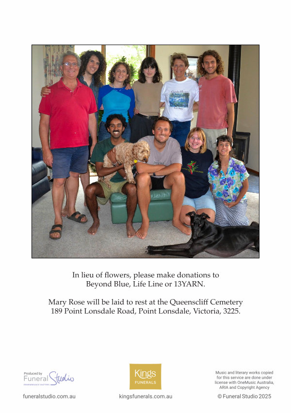 Mary Rose will be laid to rest at the Queenscliff Cemetery 189 Point Lonsdale Road, Point Lonsdale, Victoria, 3225.