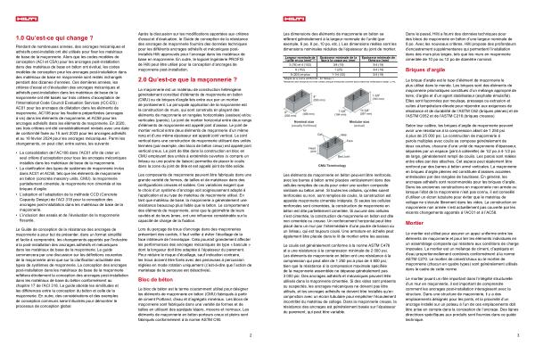 Le Guide de conception de la résistance des ancrages de maçonnerie a pour but de présenter, dans un format simplifié et facile à comprendre, les changements apportés par l ' industrie à la post-installation des ancrages adhésifs et mécaniques dans les matériaux de base de la maçonnerie. Le guide commencera par une discussion sur les définitions courantes de la maçonnerie ainsi que sur la clarification actualisée des types de systèmes de maçonnerie. La conception des ancrages post-installation dans les matériaux de base de la maçonnerie reflétera étroitement la conception des ancrages post-installation dans les matériaux de base du béton conformément au chapitre 17 de l’ ACI 318. Le guide aborde les similitudes et les différences entre la conception du béton et celle de la maçonnerie. En outre, des considérations et des exemples de conception communs seront illustrés pour démontrer le processus de conception global.