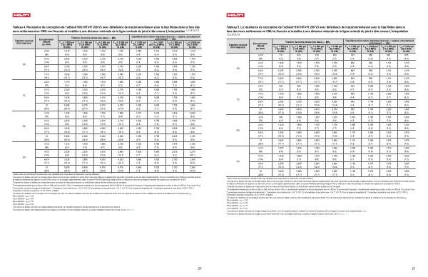 Tableau 4. Résistance de conception de l’ adhésif Hilti HIT-HY 200 V3 avec défaillance de maçonnerie / liaison pour la tige filetée dans la face des murs entièrement en CMU non fissurés et installée à une distance minimale de la ligne centrale du joint à tête creuse L’ interpolation 1, 2, 3, 4, 5, 6, 7, 8
