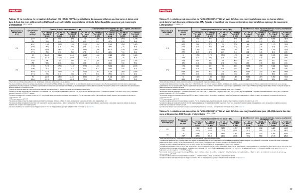 supplémentaires. Pour les conceptions avec l ' influence supplémentaire de bords proches, une distance de bord différente, ou des ancrages supplémentaires, utiliser le logiciel PROFIS Engineering Design de Hilti ou effectuer le calcul des ancrages en utilisant les équations de conception de l ' AC58. 3 Comparer les valeurs du tableau de la maçonnerie avec les valeurs de l ' acier dans l ' annexe. La valeur la moins élevée doit être utilisée pour la conception. 4 Données pour la plage de température A: Température à court terme max. = 55 ° C( 130 ° F), la température à long terme max. = 43 ° C( 110 ° F). Pour la plage de température B: Température maximale à court terme = 80 ° C( 176 ° F) | Température