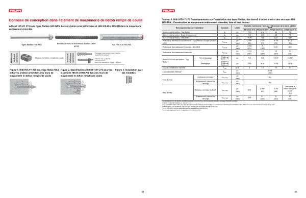 Tableau 1. Hilti HIT-HY 270 Renseignements sur l’ installation des tiges filetées, des barreS à béton armé et des ancrages Hilti HIS-( R) N- Construction en maçonnerie entièrement cimentée, face et haut du mur