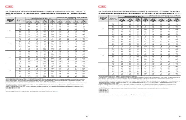 distances différentes par rapport à un joint à tête creuse, ou d ' ancrages supplémentaires, utiliser le logiciel PROFIS Engineering Design de Hilti ou effectuer le calcul des ancrages en utilisant les équations de conception de l ' AC58. 3 Comparer les valeurs du tableau de la maçonnerie avec les valeurs de l ' acier dans l ' annexe. La moindre des valeurs doit être utilisée pour la conception. 4 L’ encastrement maximal pour un bloc en bloc en CMU de 8 po est de 6-1 / 8 po. L’ encastrement maximal d’ un bloc de maçonnerie bloc en CMU de 10 pouces est de 8 pouces. L’ encastrement maximal pour un bloc en bloc en CMU de 12 po est de 10 po.