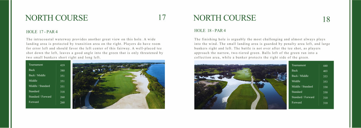 The intracoastal waterway provides another great view on this hole. A wide landing area is protected by transition area on the right. Players do have room for error left and should favor the left center of this fairway. A well-placed tee shot down the left, leaves a good angle into the green that is only threatened by two small bunkers short right and long left.