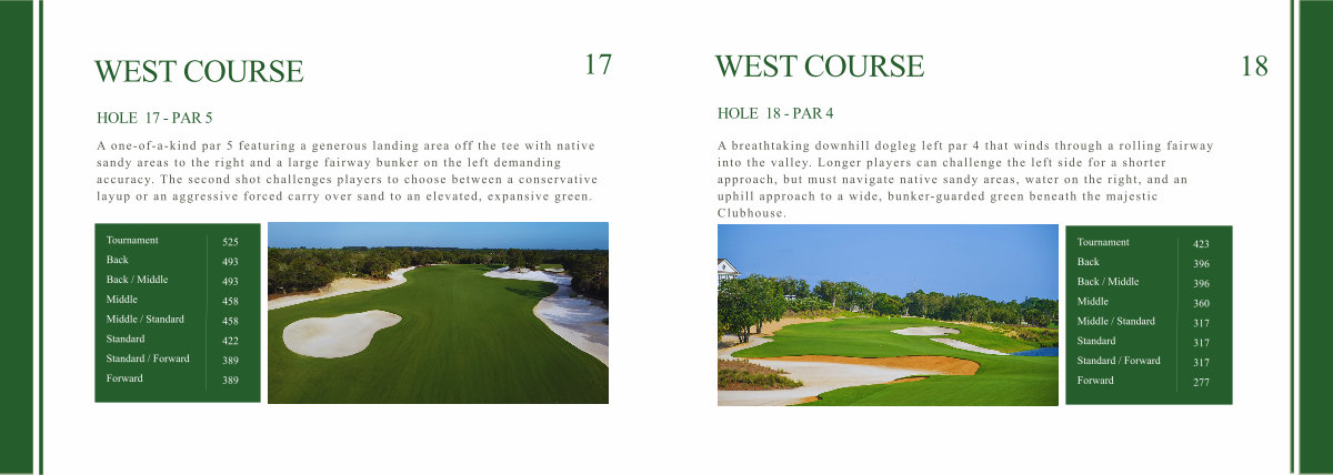 A one-of-a-kind par 5 featuring a generous landing area off the tee with native sandy areas to the right and a large fairway bunker on the left demanding accuracy. The second shot challenges players to choose between a conservative layup or an aggressive forced carry over sand to an elevated, expansive green.