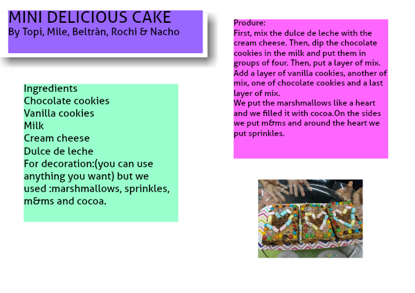 For decoration:(you can use anything you want) but we used :marshmallows, sprinkles, m&ms and cocoa.