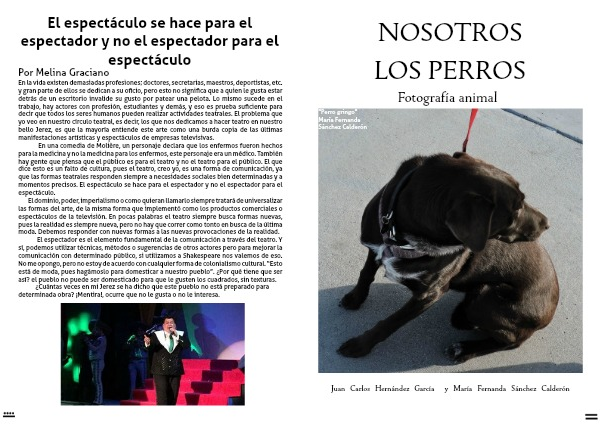 En la vida existen demasiadas profesiones; doctores, secretarias, maestros, deportistas, etc. y gran parte de ellos se dedican a su oficio, pero esto no significa que a quien le gusta estar detrás de un escritorio invalide su gusto por patear una pelota. Lo mismo sucede en el trabajo, hay actores con profesión, estudiantes y demás, y eso es prueba suficiente para decir que todos los seres humanos pueden realizar actividades teatrales. El problema que yo veo en nuestro círculo teatral, es decir, los que nos dedicamos a hacer teatro en nuestro bello Jerez, es que la mayoría entiende este arte como una burda copia de las últimas manifestaciones artísticas y espectáculos de empresas televisivas.