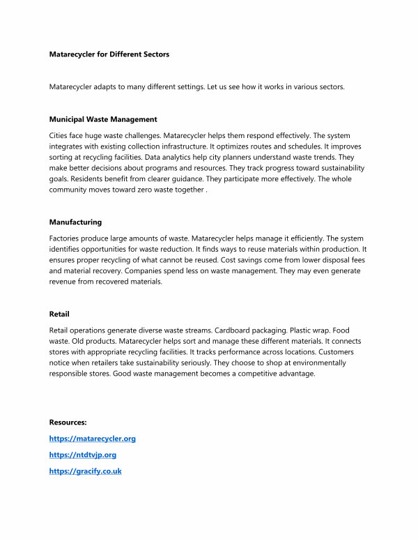 Cities face huge waste challenges. Matarecycler helps them respond effectively. The system integrates with existing collection infrastructure. It optimizes routes and schedules. It improves sorting at recycling facilities. Data analytics help city planners understand waste trends. They make better decisions about programs and resources. They track progress toward sustainability goals. Residents benefit from clearer guidance. They participate more effectively. The whole community moves toward zero waste together.