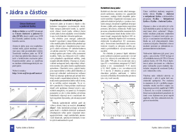 (střední hodnota „kvadrátu seniority“). Panely (a) – (c) zná - zorňují spektra pro růz né volby paramet rů modelu. Tečky na obrázcích tvoří v někte- rých případech uspo řádané mřížky, jindy na opak náhodné shlu ky. Ukazuje se, že pra - videlně seskupené body odpovídají vib rač- ním stavům, kdy jádro kmitá uspořádaným způsobem. Chaotické sta vy, jejichž kmity jsou nepra videlné a těž ko předvídatelné, se projevu jí náhodně rozházenými tečkami Panel (a) ukazuje spektrum pro přesně ře ši - telný model s uspořádanými kmity. I velmi malá změna parametrů modelu vede k to mu, že se mřížka začíná rozpadat. To je vi - dět v panelu (b). Chaos posléze zachva cuje té měř celé spektrum (kromě stavů o nej- niž ších energiích), viz panel (c). S různými parametry se ale i velmi daleko od režimu řešitelnosti objevují nové a nečekané ob- las ti regulární dynamiky, jak uka zuje panel (d). Metoda spektrálních mřížek patří do vý bavy oboru, který se nazývá „kvantový chaos“. Jeho statistické postupy se kromě jader hodí i v dalších složitých systémech obsahujících velký počet vzájemně inter- agujících částic – např. molekulách, atomo- vých klastrech, optických dutinách, kvan- tových kondenzátech a pod.