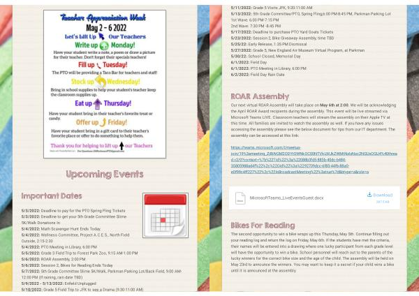 5 / 3 / 2022 : Deadline to pay for the PTO Spring Fling Tickets 5 / 3 / 2022 : Deadline to get your 5th Grade Committee Slime 5K / Walk Donations In 5 / 4 / 2022 : Math Scavenger Hunt Ends Today 5 / 4 / 2022 : Wellness Committee , Project A . C . E . S ., North Field Outside , 2:15-2:30 5 / 4 / 2022 : PTO Meeting in Library , 6:00 PM 5 / 5 / 2022 : Grade 3 Field Trip to Forest Park Zoo , 9:15 AM-1:00 PM 5 / 6 / 2022 : ROAR Assembly , 2:00 PM 5 / 6 / 2022 : Session 2 , Bikes for Reading Ends Today 5 / 7 / 2022 : 5th Grade Committee Slime 5K / Walk , Parkman Parking Lot / Back Field , 9:00 AM- 12:00 PM ( If raining , rain date TBD ) 5 / 9 / 2022 - 5 / 13 / 2022 : En eld Unplugged 5 / 10 / 2022 : Grade 5 Field Trip to JFK to see a Drama ( 9:30-11:00 AM )