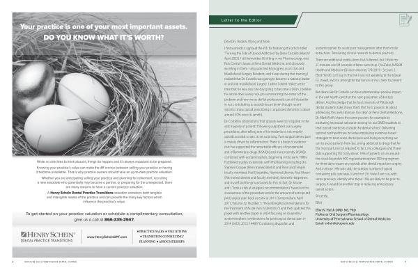 I first wanted to applaud the PDJ for featuring the article titled “ Turning the Tide of Opioid Addiction ” by Dean Costello ( March / April 2022 ). I still remember BJ sitting in my Pharmacology and Pain Control classes at Penn Dental Medicine , and obviously excelling in them . I also watched BJ progress as an Oral and Maxillofacial Surgery Resident , and it was during that training I realized that Dr . Costello was going to become a national leader in oral and maxillofacial surgery . I admit I didn ’ t realize at the time that he was also one day going to become a Dean . I believe his article does a very nice job summarizing the extent of the problem and how we as dental professionals can still do better in not contributing to opioid misuse ( even though recent statistics show opioid prescribing in organized dentistry is down around 50 % since its zenith ).