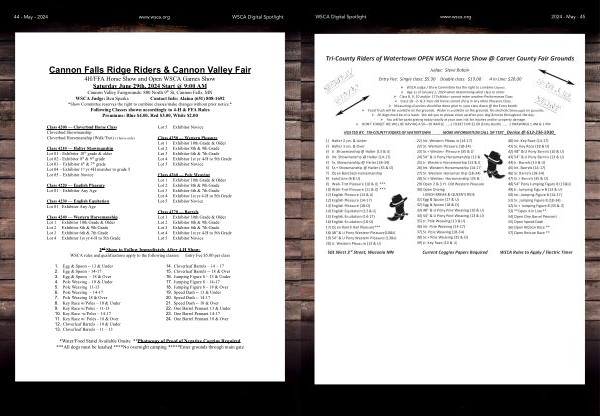 Cannon Falls Ridge Riders & Cannon Valley Fair 4H / FFA Horse Show and Open WSCA Games Show Saturday June 29th , 2024 Start @ 9:00 AM Cannon Valley Fairgrounds : 800 North 9 th St , Cannon Falls , MN WSCA Judge : Ben Sparks Contact Info : Alaina ( 651 ) 808-1692 * Show Committee reserves the right to combine classes / make changes without prior notice .* Following Classes shown accordingly to 4-H & FFA Rules Premiums : Blue $ 4.00 , Red $ 3.00 , White $ 2.00