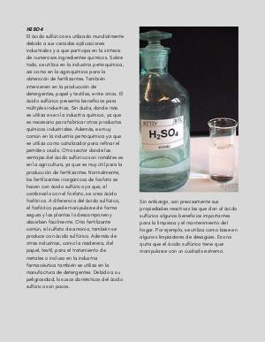 H2SO4 El ácido sulfúrico es utilizado mundialmente debido a sus variadas aplicaciones industriales y a que participa en la síntesis de numerosos ingredientes químicos . Sobre todo , se utiliza en la industria petroquímica , así como en la agroquímica para la obtención de fertilizantes . También intervienen en la producción de detergentes , papel y textiles , entre otros . El ácido sulfúrico presenta beneficios para múltiples industrias . Sin duda , donde más se utiliza es en la industria química , ya que es necesario para fabricar otros productos químicos industriales . Además , es muy común en la industria petroquímica ya que se utiliza como catalizador para refinar el petróleo crudo . Otro sector donde las ventajas del ácido sulfúrico son notables es en la agricultura , ya que es muy útil para la producción de fertilizantes . Normalmente , los fertilizantes inorgánicos de fosfato se hacen con ácido sulfúrico ya que , al combinarlo con el fosfato , se crea ácido fosfórico . A diferencia del ácido sulfúrico , el fosfórico puede manipularse de forma segura y las plantas lo descomponen y absorben fácilmente . Otro fertilizante común , el sulfato de amonio , también se produce con ácido sulfúrico . Además de otras industrias , como la maderera , del papel , textil , para el tratamiento de metales o incluso en la industria farmacéutica también se utiliza en la manufactura de detergentes . Debido a su peligrosidad , los usos domésticos del ácido sulfúrico son pocos .