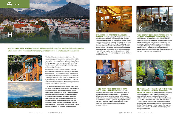 IF YOU WANT THE INDEPENDENCE THAT COMES WITH A RENTAL HOUSE as well as the hospitality of an inn or lodge, consider staying at one of Sitka ' s cozy bed and breakfasts. Each B & B provides a different experience; some have access to full decks or outdoor hot tubs, while others boast hearty, hot breakfasts and homemade pastries. Regardless of your preference, a stay with a seasoned Sitka local is sure to give you an inside look at our island community and the many activities it offers.