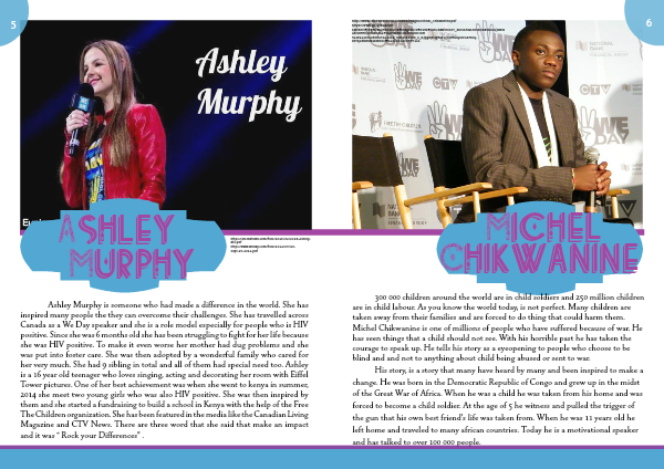 Ashley Murphy is someone who had made a difference in the world. She has inspired many people the they can overcome their challenges. She has travelled across Canada as a We Day speaker and she is a role model especially for people who is HIV positive. Since she was 6 months old she has been struggling to fight for her life because she was HIV positive. To make it even worse her mother had dug problems and she was put into foster care. She was then adopted by a wonderful family who cared for her very much. She had 9 sibling in total and all of them had special need too. Ashley is a 16 year old teenager who loves singing, acting and decorating her room with Eiffel Tower pictures. One of her best achievement was when she went to kenya in summer, 2014 she meet two young girls who was also HIV positive. She was then inspired by them and she started a fundraising to build a school in Kenya with the help of the Free The Children organization. She has been featured in the media like the Canadian Living Magazine and CTV News. There are three word that she said that make an impact and it was “ Rock your Differences” .