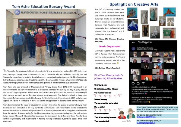 Tom Ashe who was principal of Maynooth Post Primary School from 1971-1997 , mentioned in an interview that he has very fond memories of the school and feels this bursary is a way of giving back to the students by giving them a head start on their future career paths , with the hope that they will enjoy their careers as much as he did . Any student from Maynooth Post Primary School or Maynooth Community College who completed the Leaving Certificate Course in these schools in 2021 and who have applied for a place in Third Level in 2021 , can submit an application to be considered for the Bursary .
