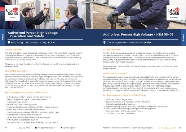 This City & Guilds Assured course will enable you to gain the additional knowledge required to carry out Authorised Person duties and responsibilities in order to achieve compliance with the requirements of the Electricity at Work Regulations 1989 and the specific requirements of Health Technical Memorandum 06-03 Electrical Safety Guidance for High Voltage Systems .