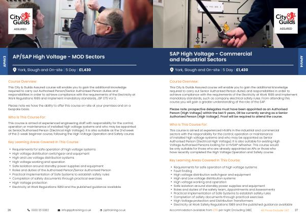 This City & Guilds Assured course will enable you to gain the additional knowledge required to carry out Authorised Person / Senior Authorised Person duties and responsibilities in order to achieve compliance with the requirements of the Electricity at Work Regulations 1989 and implement mandatory standards , JSP 375 Vol 3 .
