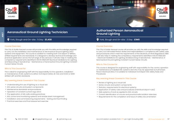 This City & Guilds Assured course will provide you with the skills and knowledge required to carry out the installation and maintenance of Aeronautical Ground Lighting ( AGL ) systems and equipment . The course is suitable for meeting both Civil airport or Military airfield requirements and standards . It is designed to develop technical knowledge and practical application across the full range of AGL services . It will also help in meeting the competency requirements identified in BS EN 61821:2011 Electrical Installations for Lighting and Beaconing of Aerodromes - Maintenance of Aeronautical Ground Lighting Constant Current Series Circuits .