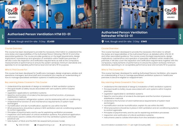 This course has been developed to provide the necessary information to understand the core duties and responsibilities of the Authorised Person following HTM 03-01 and other associated guidance . The course provides guidance on the legal requirements , design implications , maintenance and operation of ventilation within healthcare premises . It will also cover the inspection and verification requirements as well as the compulsory measurements of performance to ensure the system achieves minimum standards and operates to an acceptable performance level and remains fit for purpose .