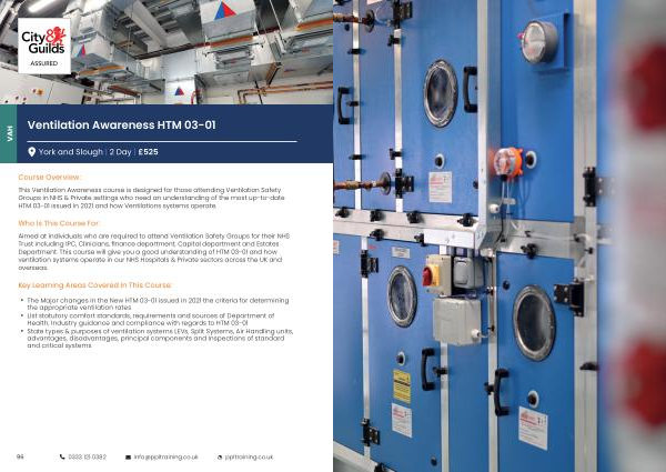 Aimed at individuals who are required to attend Ventilation Safety Groups for their NHS Trust including IPC , Clinicians , finance department , Capital department and Estates Department . This course will give you a good understanding of HTM 03-01 and how ventilation systems operate in our NHS Hospitals & Private sectors across the UK and overseas .