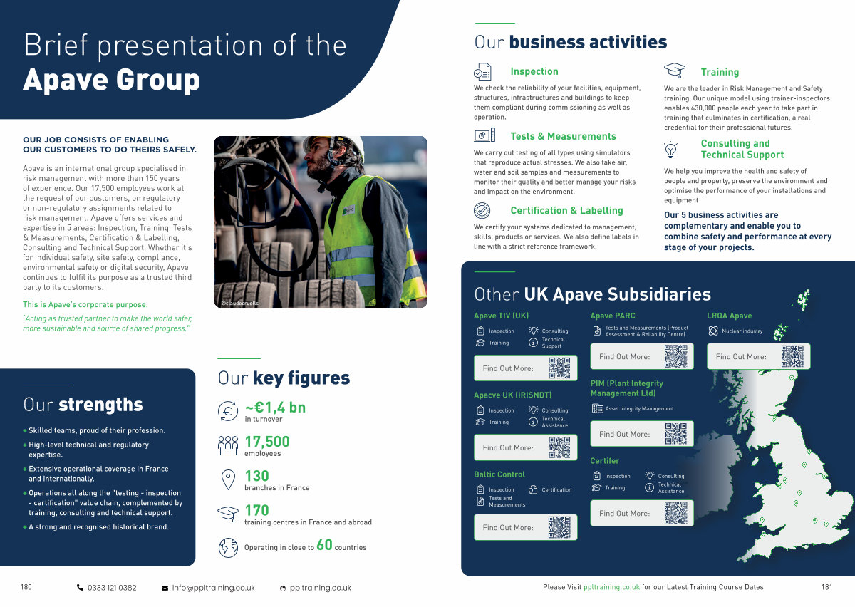Apave is an international group specialised in risk management with more than 150 years of experience. Our 17,500 employees work at the request of our customers, on regulatory or non-regulatory assignments related to risk management. Apave offers services and expertise in 5 areas: Inspection, Training, Tests & Measurements, Certification & Labelling, Consulting and Technical Support. Whether it ' s for individual safety, site safety, compliance, environmental safety or digital security, Apave continues to fulfil its purpose as a trusted third party to its customers.