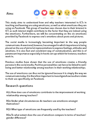 The use of emoticons can thus not be ignored because it is simply the way we communicate today. It is therefore important to investigate how teachers relate to their use specifically on Facebook.