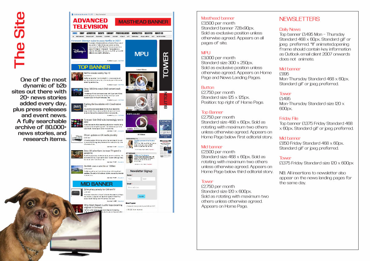 Top Banner £ 2,750 per month Standard size 468 x 60px. Sold as rotating with maximum two others unless otherwise agreed. Appears on Home Page below first editorial story.