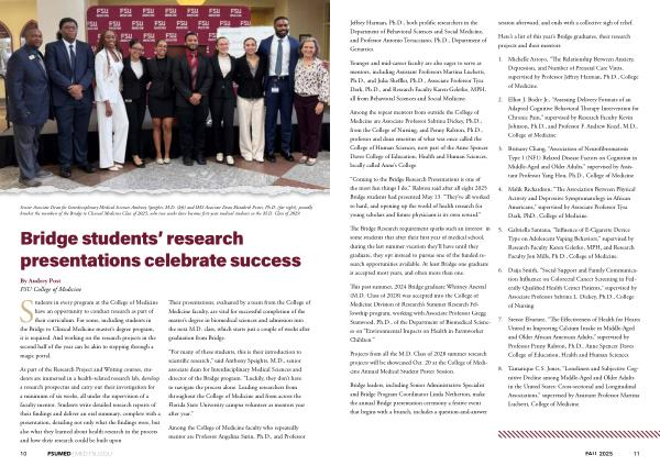 “ For many of these students, this is their introduction to scientific research,” said Anthony Speights, M. D., senior associate dean for Interdisciplinary Medical Sciences and director of the Bridge program.“ Luckily, they don’ t have to navigate the process alone. Leading researchers from throughout the College of Medicine and from across the Florida State University campus volunteer as mentors year after year.”
