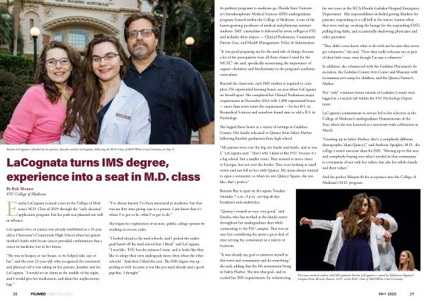 “ I looked ahead at the med schools, and I picked the undergrad based off the med school that I liked,” said LaCognata.“ I was like,‘ FSU has the mission I want, and it looks like they like to adopt their own undergrads more often [ than the other schools ].’ And then I liked the area. The IMS degree was appealing as well, because it was like pre-med already and a good pipeline, I thought.”