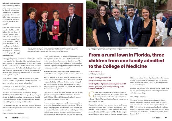 Meet the Brown family, whose roots run deep in rural Hosford. They skew all the odds when it comes to getting children admitted to College of Medicine— two, Jimmy and Ann Marie, graduated with their M. D. degrees, and Mary Beth is completing her Master of Science degree in Physician Assistant Practice.
