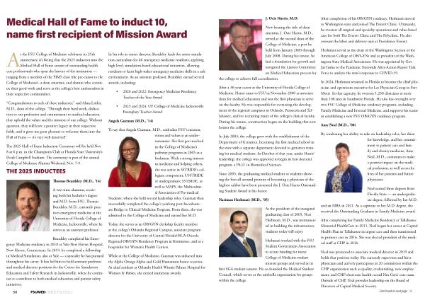 As the FSU College of Medicine celebrates its 25th anniversary, it’ s fitting that the 2025 inductees into the Medical Hall of Fame consist of outstanding health care professionals who span the history of the institution— ranging from a member of the PIMS class( the pre-cursor to the College of Medicine), a dean emeritus, and alumni who continue their good work and serve as the college’ s best ambassadors in their respective communities.