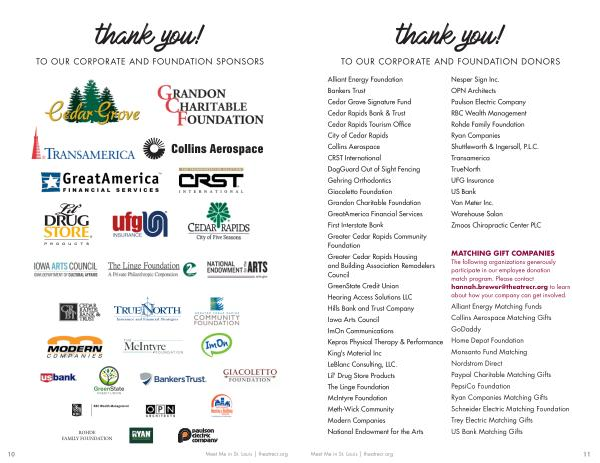 Alliant Energy Foundation Bankers Trust Cedar Grove Signature Fund Cedar Rapids Bank & Trust Cedar Rapids Tourism Office City of Cedar Rapids Collins Aerospace CRST International DogGuard Out of Sight Fencing Gehring Orthodontics Giacoletto Foundation Grandon Charitable Foundation GreatAmerica Financial Services First Interstate Bank Greater Cedar Rapids Community Foundation Greater Cedar Rapids Housing and Building Association Remodelers Council GreenState Credit Union Hearing Access Solutions LLC Hills Bank and Trust Company Iowa Arts Council ImOn Communications Kepros Physical Therapy & Performance King ' s Material Inc LeBlanc Consulting , LLC . Lil ' Drug Store Products The Linge Foundation McIntyre Foundation Meth-Wick Community Modern Companies National Endowment for the Arts