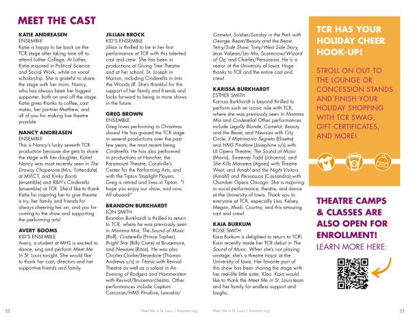 KAIA BURKUM ROSE SMITH Kaia Burkum is delighted to return to TCR ! Kaia recently made her TCR debut in The Sound of Music . When she ’ s not playing onstage , she ’ s a theatre major at the University of Iowa . Her favorite part of this show has been sharing the stage with her real-life little sister , Kleo . Kaia would like to thank the Meet Me in St . Louis team and her family for endless support and laughs .