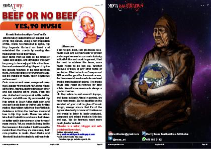 differences. I am not pro- beef, I am pro music. As a music lover and a cheerleader of growth and competiveness in our music industry in South Africa and music in general, I feel the need to address this issue, more music needs to be put out, whether because of beef, or any other forms of inspiration. Diss tracks from Cassper and AKA would be good for the music scene, the drama would reach a whole new level and be immortalised in sound. The tracks would also result in revenue for both artists. We all know revenue is always a good motivation. Hip Hop artists in and around Limpopo, and those in South Africa in general, we need more music. Do not sacrifice on the standard of your craft to give off music though, always ensure that it ' s of the highest standard you know of. I believe no one wants to listen to badly produced, composed and mixed tracks in this day and age. We do however, want more music, beef or no beef. * Chantel is a writer, blogger and selfproclaimed lover of art.