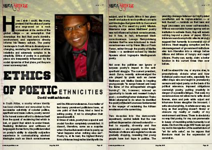 subject, and in South Africa it has given breath and pulse to socio-political concepts and ideologies that gave birth to the current country. As if to assert my point, Mbulelo Mzamane says James Matthews ' poetry was not influenced by black consciousness, but it has, in fact, influenced black consciousness. Lesego Rampolokeng declares that he was introduced to black consciousness not by Steve Biko or Franz Fanon, rather through the poetry of Mafika Gwala— a sentiment echoed by Mxolisi Nyezwa about Ingoapele Madingoane ' s poetry.