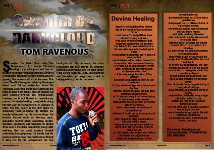 background. Furthermore, he also recognises the role played by Limpopo based poets / mc in his art. He cites Street Poet, Lyrical Surgeon, Lezz, Epic Manifest and Kamelion as being very crucial in helping where growth is concerned.