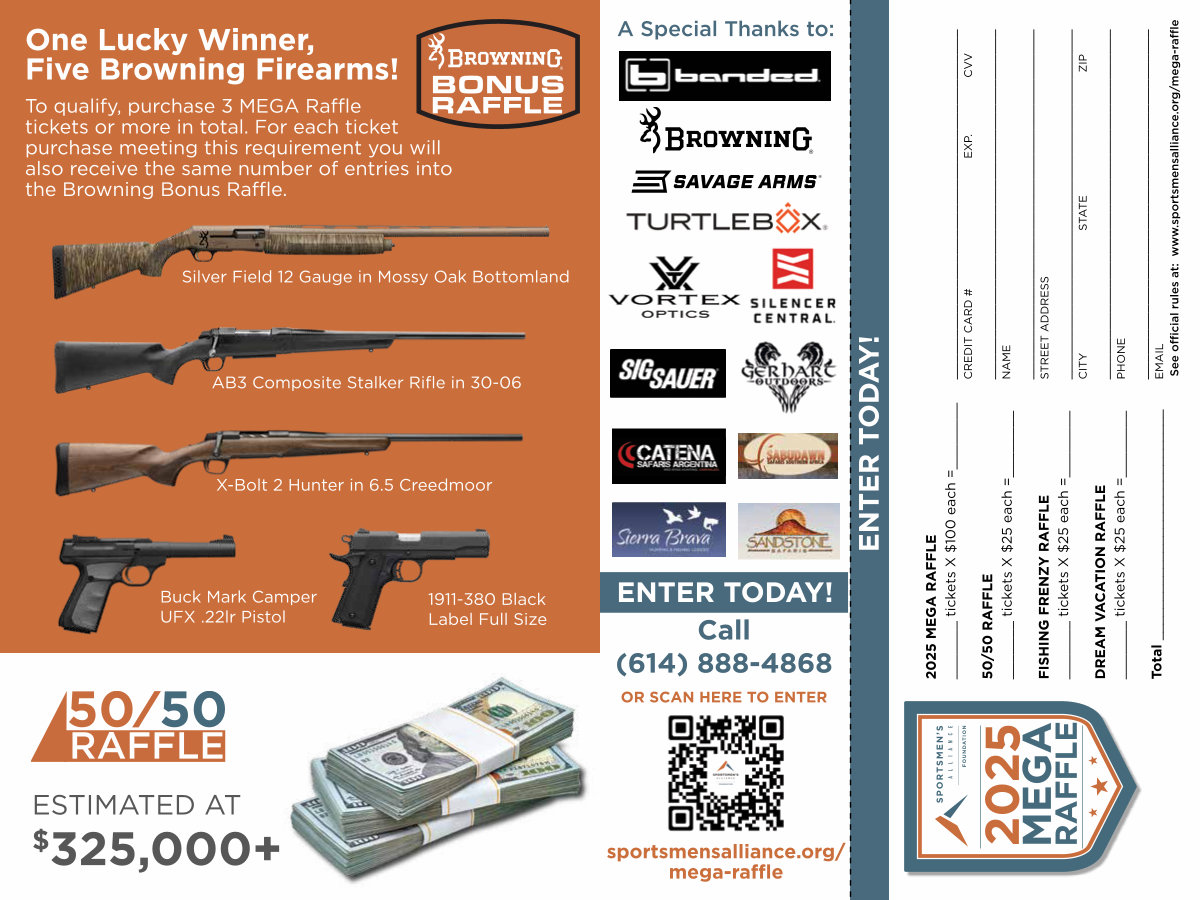 To qualify, purchase 3 MEGA Raffle tickets or more in total. For each ticket purchase meeting this requirement you will also receive the same number of entries into the Browning Bonus Raffle.