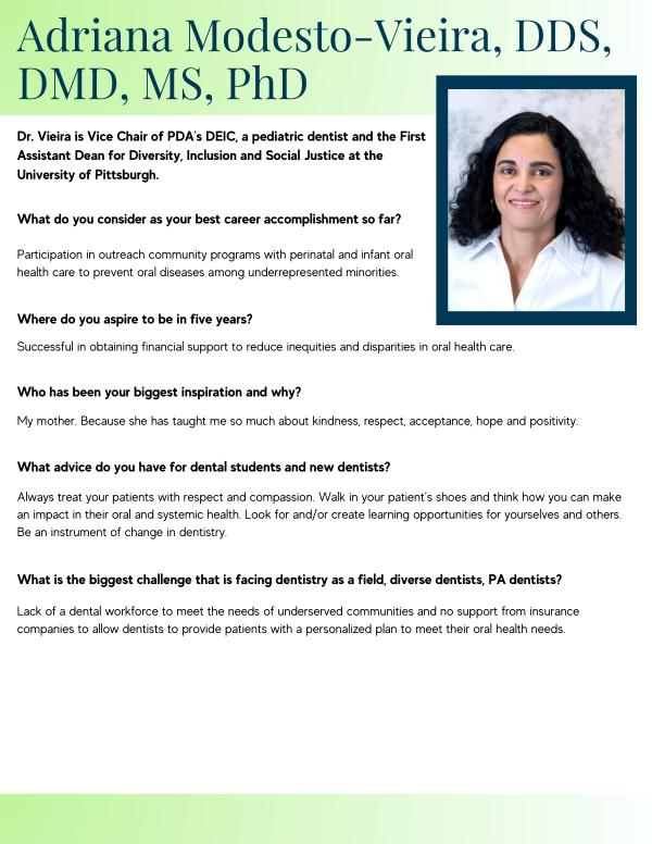 Dr . Vieira is Vice Chair of PDA ’ s DEIC , a pediatric dentist and the First Assistant Dean for Diversity , Inclusion and Social Justice at the University of Pittsburgh .