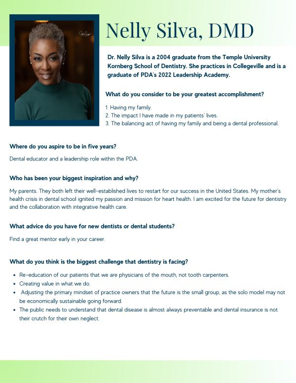Dr . Nelly Silva is a 2004 graduate from the Temple University Kornberg School of Dentistry . She practices in Collegeville and is a graduate of PDA ’ s 2022 Leadership Academy .