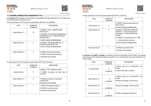 Las maestras PT han atendido a 21 Alumnos / as con Necesidades Educativas Especiales. En 14 de estos casos ha intervenido también la profesora de A. L.