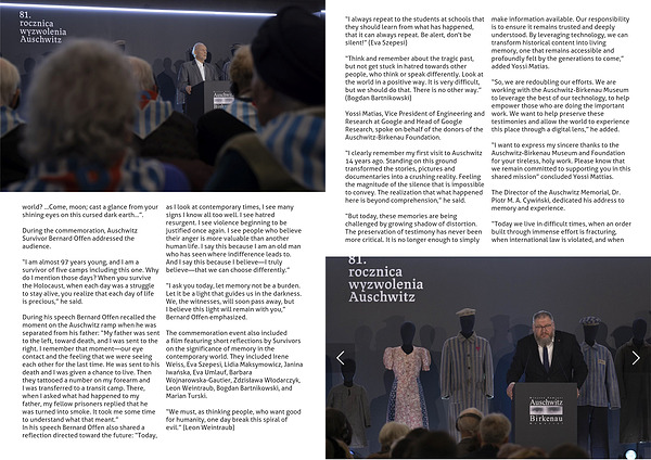 a film featuring short reflections by Survivors on the significance of memory in the contemporary world. They included Irene Weiss, Eva Szepesi, Lidia Maksymowicz, Janina Iwańska, Eva Umlauf, Barbara Wojnarowska-Gautier, Zdzisława Włodarczyk, Leon Weintraub, Bogdan Bartnikowski, and Marian Turski.