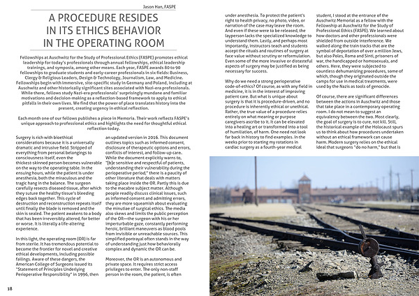 Why do we need a strong perioperative code-of-ethics? Of course, as with any field in medicine, it is in the interest of improving patient care. But what is unique about surgery is that it is procedure-driven, and no procedure is inherently ethical or unethical. Rather, the true value of a procedure relies entirely on what meaning or purpose caregivers ascribe to it. It can be elevated into a healing art or transformed into a tool of humiliation, of harm. One need not look far back in history to find examples. In the weeks prior to starting my rotations in cardiac surgery as a fourth-year medical student, I stood at the entrance of the Auschwitz Memorial as a fellow with the Fellowship at Auschwitz for the Study of Professional Ethics (FASPE). We learned about how doctors and other professionals were shielded from outside interference. We walked along the train tracks that are the symbol of deportation of over a million Jews, but also Poles, Roma and Sinti, prisoners of war, the handicapped or homosexuals, and others. Here, they were subjected to countless dehumanizing procedures, some of which, though they originated outside the camps for use in medical treatments, were used by the Nazis as tools of genocide.