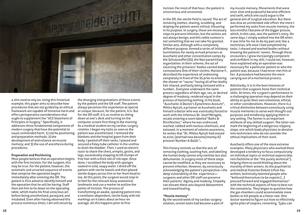 a slim reed to rely on. Using this historical example, this paper aims to describe how procedures that are not guided by an ethical framework are capable of immense harm and offers perioperative considerations that ought to supplement the “ACS Statement of Principles in Surgery.” Specifically, it addresses three fundamental components of modern surgery that have the potential to cause unintended harm: 1) sterile positioning and preparation methods; 2) the development of and reliance on muscle memory; and 3) the use of anesthesia during procedures.