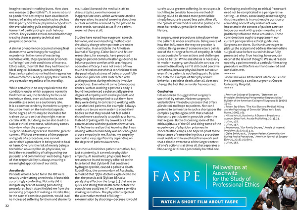 Anesthesia diminishes patient sensation, but, just as potently, it can reduce physician empathy. At Auschwitz, physicians found reassurance in and strongly adhered to the false belief that Zyklon-B that contained hydrogen cyanide, caused a painless death. Rudolf Höss, the commandant of Auschwitz, remarked that “[t]he doctors explained to me that the prussic acid [Zyklon-B] had a paralyzing effect on the lungs […] that was so quick and strong that death came before the convulsions could set in” and cause a terrible choking sensation8. The physicians rejected the alternative method of killing— extermination by shooting—because it would surely cause greater suffering. In retrospect, it is chilling to consider how one method of killing could be deemed more permissible simply because it caused less pain. After all, the “painless” method resulted in perhaps the most horrendous genocide in mankind’s history.