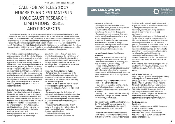 In the forthcoming issue of Zagłada Żydów. Studia i Materiały (Holocaust: Studies and Materials), we invite a critical reflection on estimates and numerical data in Holocaust research. Our interest extends not only to the territories of occupied Poland and Polish debates, but also to a broadly understood international perspective. We welcome contributions from scholars working on quantitative methodologies—including analysts, statisticians, and demographers—as well as researchers addressing specific issues through quantitative approaches. We also invite submissions discussing the significance of such research, its difficulties, limits, risks, and the manipulations to which quantitative findings may be subjected. We further encourage texts that synthesize and assess the debates conducted to date.
