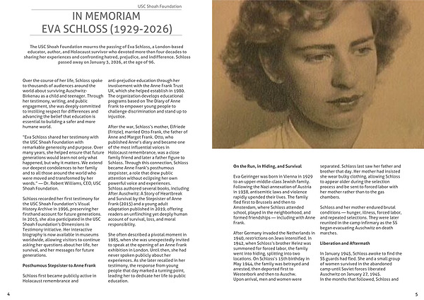 “Eva Schloss shared her testimony with the USC Shoah Foundation with remarkable generosity and purpose. Over many years, she helped ensure that future generations would learn not only what happened, but why it matters. We extend our deepest condolences to her family and to all those around the world who were moved and transformed by her words.” — Dr. Robert Williams, CEO, USC Shoah Foundation.