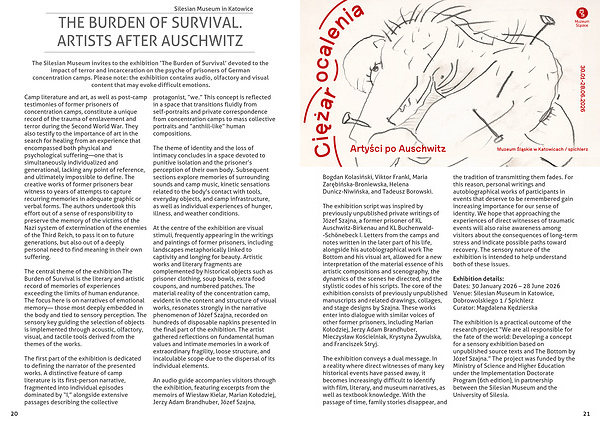 Camp literature and art, as well as post-camp testimonies of former prisoners of concentration camps, constitute a unique record of the trauma of enslavement and terror during the Second World War. They also testify to the importance of art in the search for healing from an experience that encompassed both physical and psychological suffering—one that is simultaneously individualized and generational, lacking any point of reference, and ultimately impossible to define. The creative works of former prisoners bear witness to years of attempts to capture recurring memories in adequate graphic or verbal forms. The authors undertook this effort out of a sense of responsibility to preserve the memory of the victims of the Nazi system of extermination of the enemies of the Third Reich, to pass it on to future generations, but also out of a deeply personal need to find meaning in their own suffering.